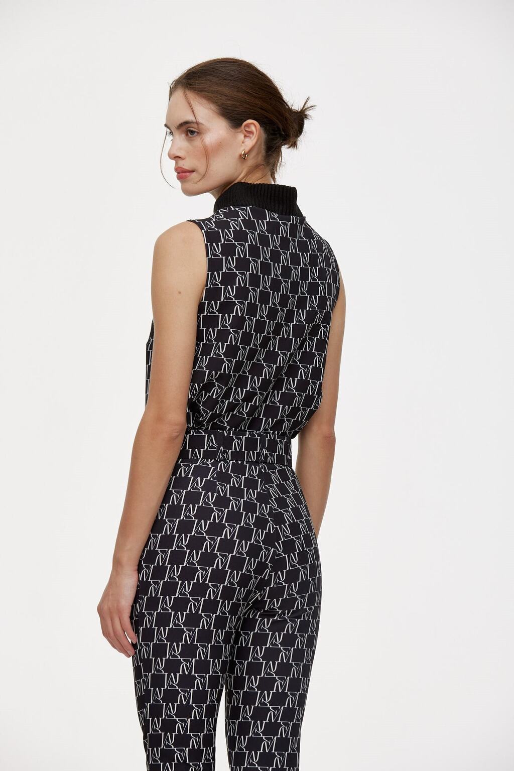 Top Ricci: confeccionado en sastrero sublimado con un elegante patrón geométrico en blanco, destaca por su cuello alto de canalé negro que aporta contraste y textura. De corte recto y ajustado al torso, ofrece un estilo moderno y sofisticado ideal para elevar cualquier look.