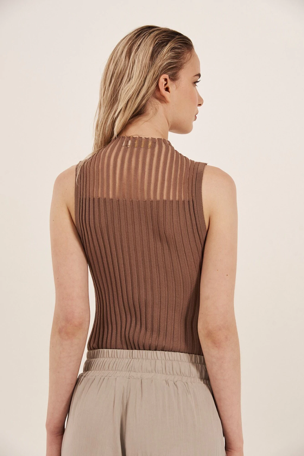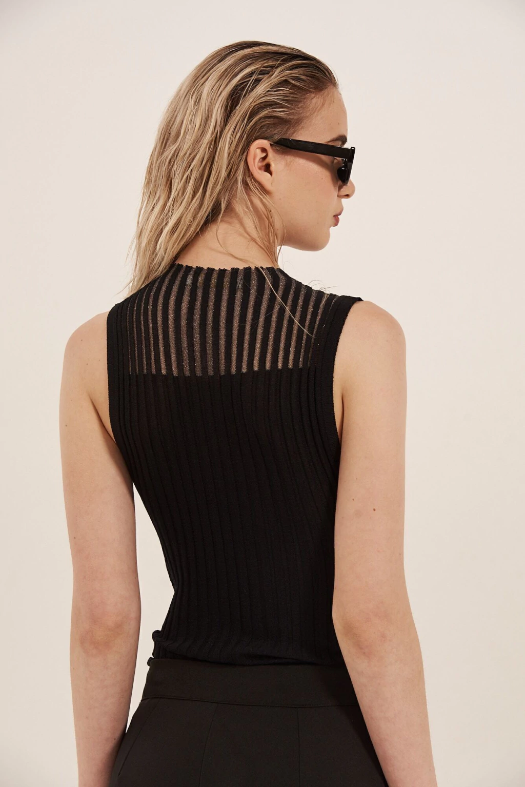Top sin mangas de color negro con textura acanalada y cuello subido. Presenta pequeños apliques brillantes en la parte superior que añaden un detalle luminoso y sofisticado, manteniendo un diseño ajustado que realza la figura.