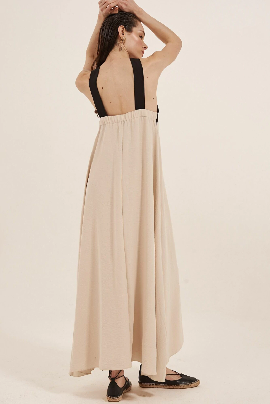 El vestido gerbera confeccionado en tencel cupro con Spandex. Presenta un escote cruzado con breteles anchos en contraste que se ajustan en la parte posterior, dejando la espalda descubierta. Su silueta larga y amplia aporta comodidad y elegancia, ideal para usar tanto de día como de noche.